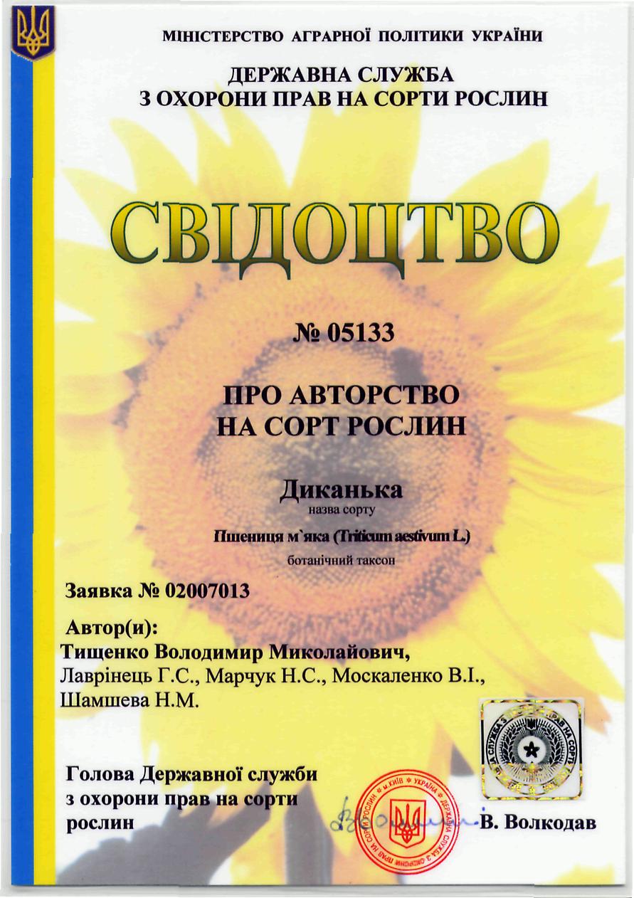 Авторське свідоцтво. Пшениця м'яка Диканька