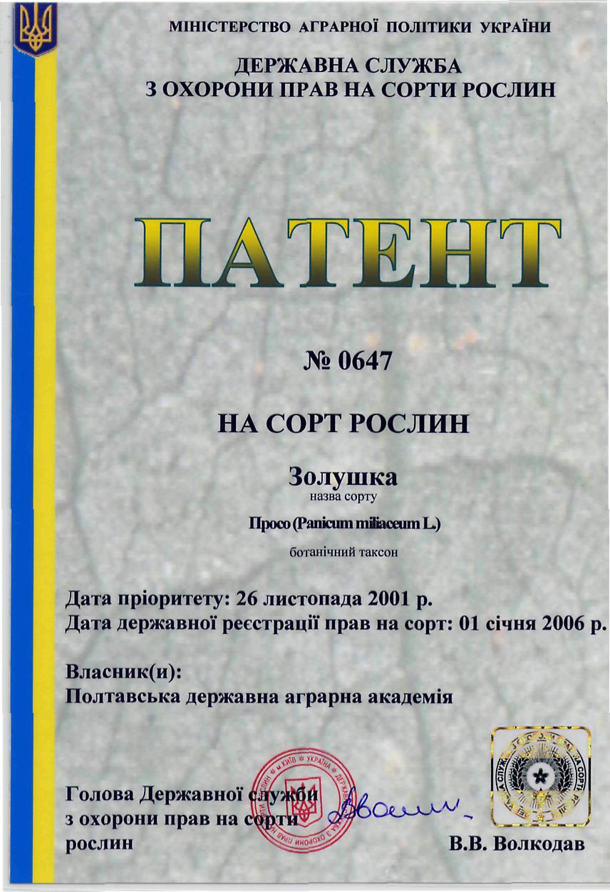 Патент на сорт. Просо Золушка