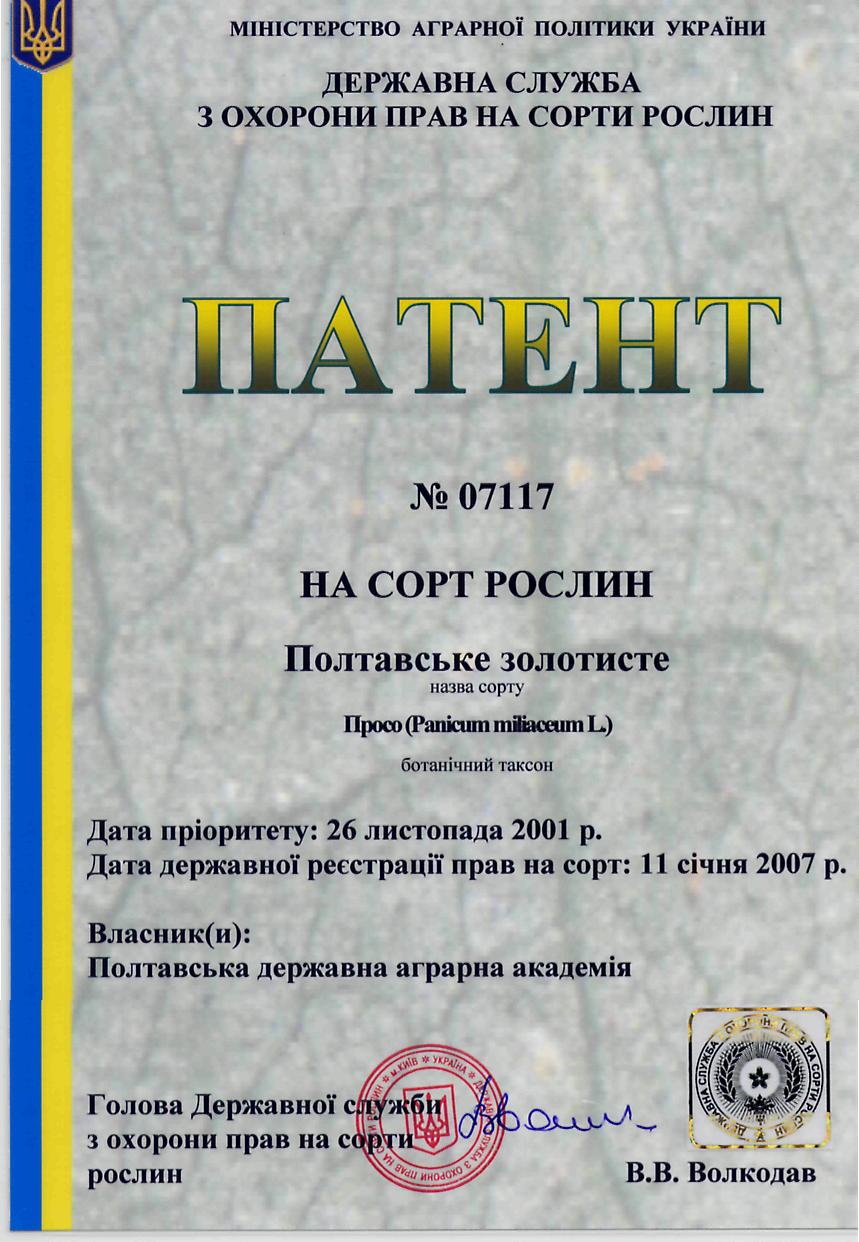 Патент на сорт. Просо Полтавське золотисте