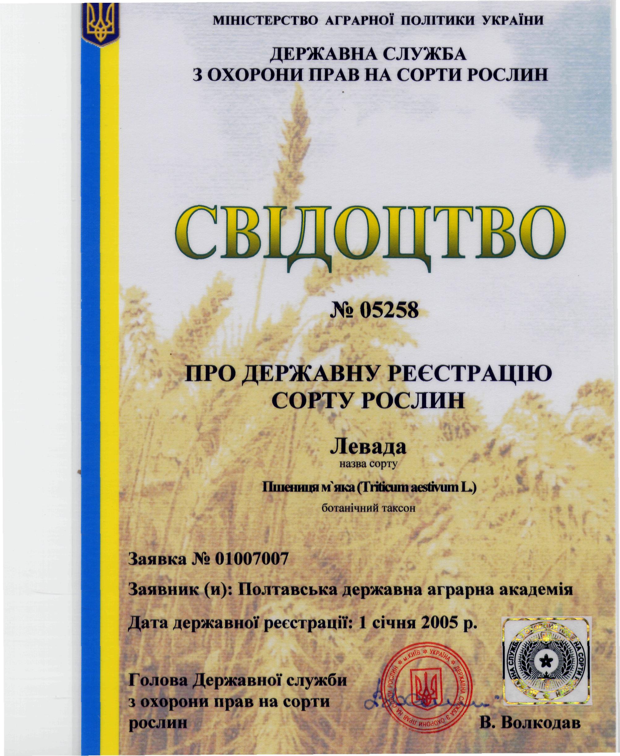 Свідоцтво про держ. реєстрацію. Пшениця м'яка Левада